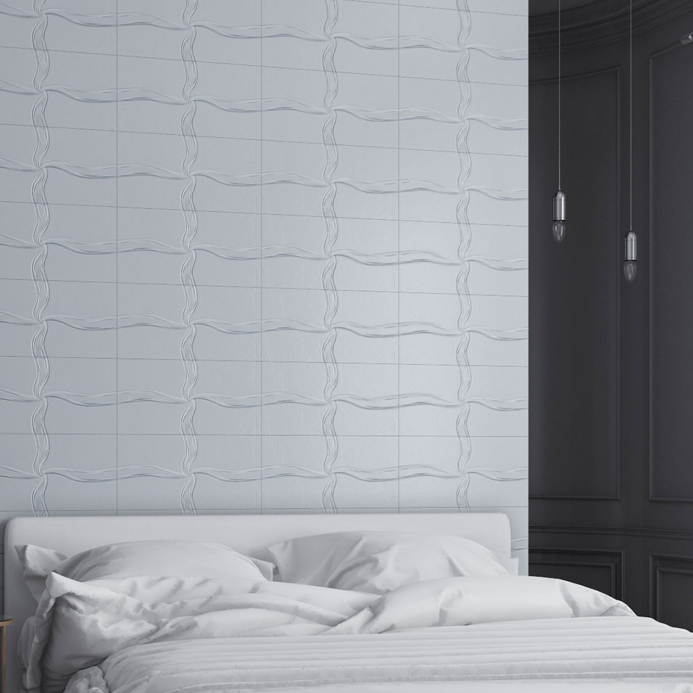 Ceramic tile made of natural mineral material that improves air quality in spaces such as leaves, has an antibacterial effect, prevents condensation, and has humidity control functions. The engraved, three-dimensional design adds depth to the space.
